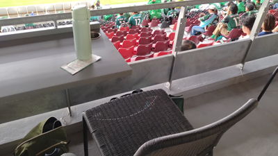 バックスタンドの上段、3人1セットで、テーブル付きの不思議な席を購入してみました。