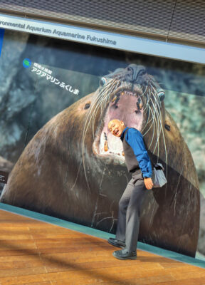 入口の巨大アザラシの口に吸い込まれそうになる先生の1枚から、