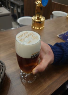 最後は、お待ちかねの試飲コーナー。夫はこんなラテアートならぬビアアートをしてもらっていました。