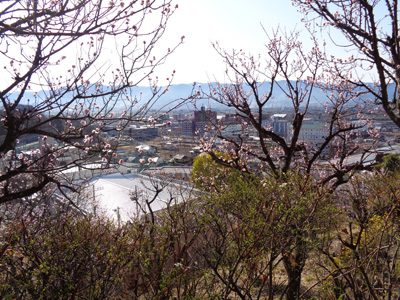 梅林の向こう、甲府市街の向こう、手前の山の向こうに富士山が!