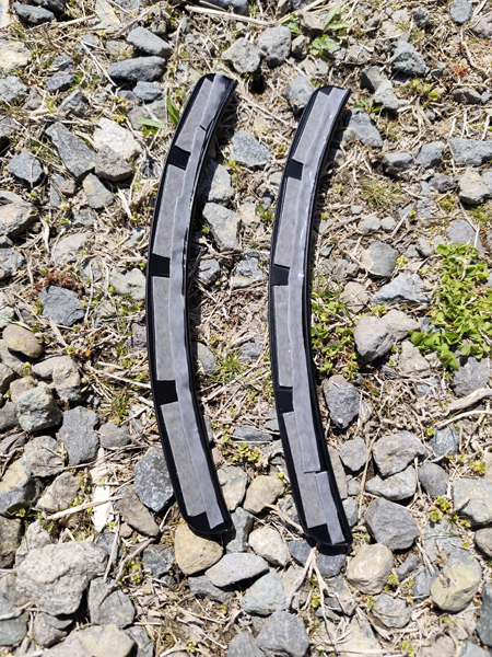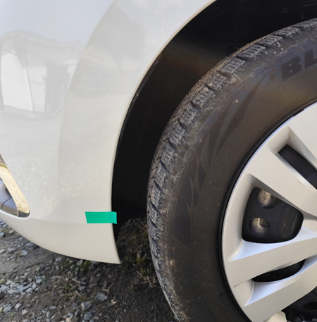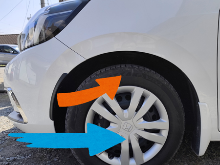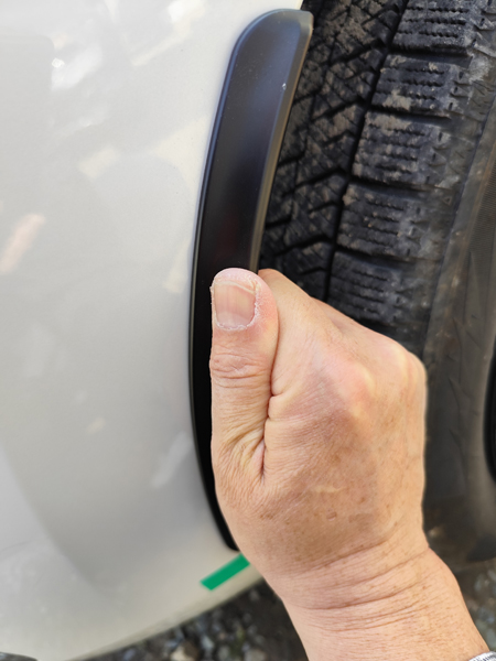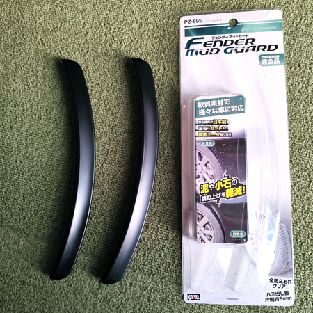 マッドガードです。本来ならタイヤハウス後方に取り付けてタイヤが跳ね上げた泥や小石をガードするものなのですが、今回は空気の流れを変えるためにタイヤハウス前方に取り付けてみます。車体より少しはみ出しますが車検対応の範囲内となっています。